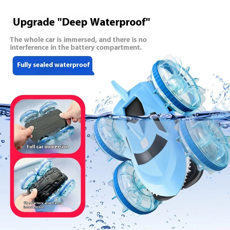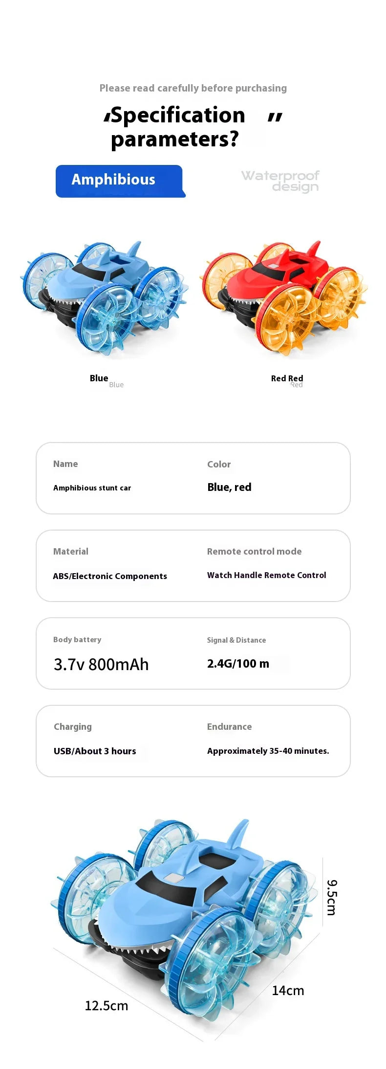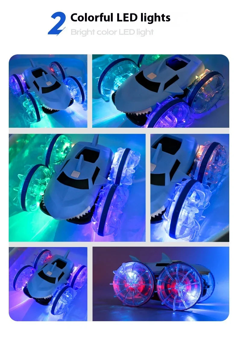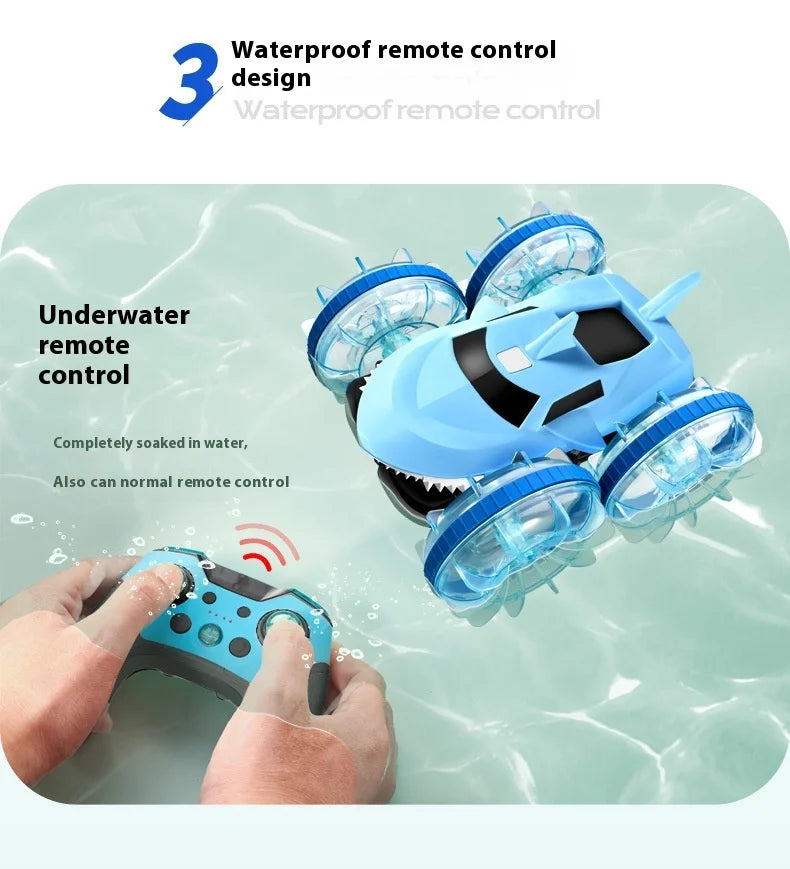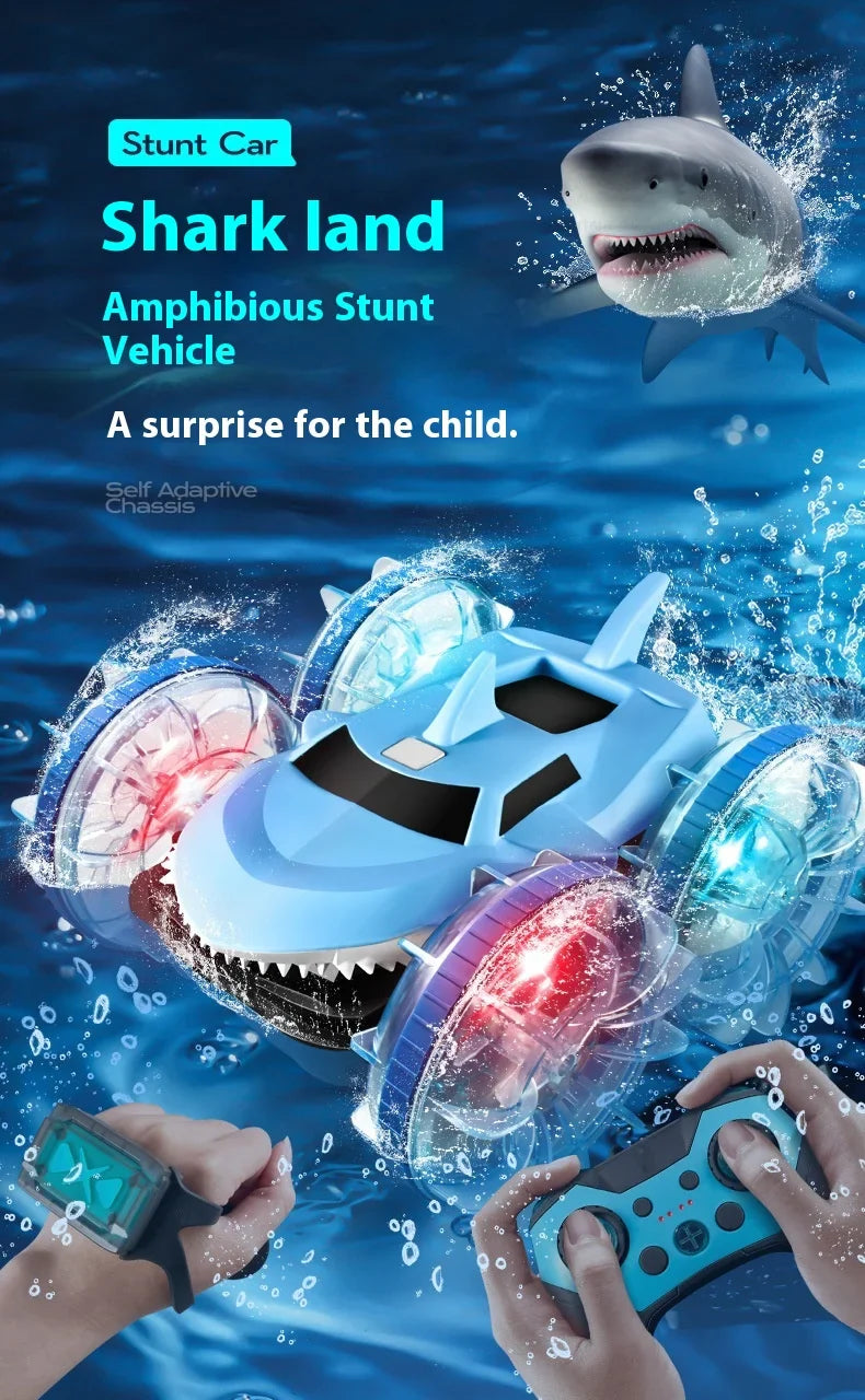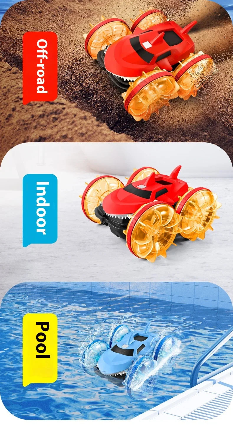 Roar into action on land and beyond! This amphibious shark-themed RC car tumbles, flips, and races anywhere—indoors, outdoors, even through shallow water!