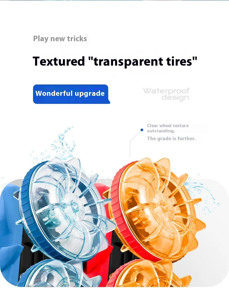 The car is equipped with large, multi-directional wheels that allow it to perform flips, spins, and full 360-degree rotations on various surfaces.